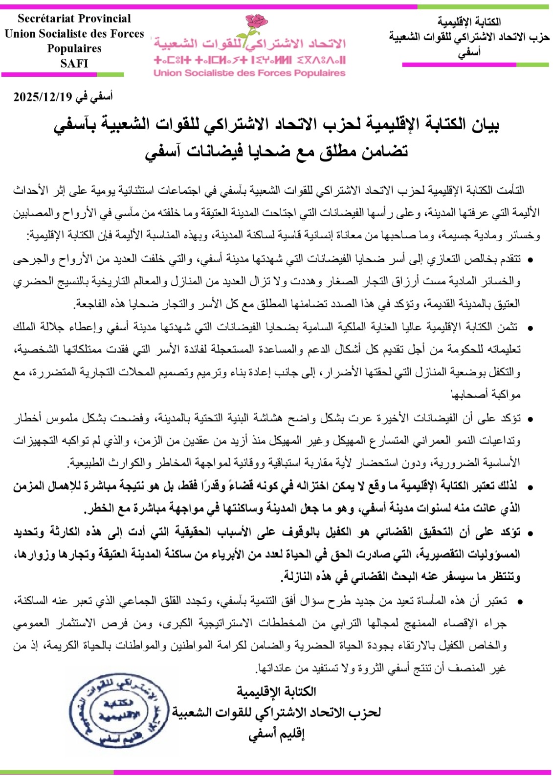 الحزب في أسفي يسجل تضامنه المطلق مع الضحايا ويؤكد على أن التحقيق القضائي هو الكفيل بالكشف عن الأسباب الحقيقية التي أدت لوقوع الكارثة ..الاتحاديون يتقدمون بتعازيهم الصادقة لعوائل وأهالي الضحايا ..فيما يلي نص البيان الصادر عن الكتابة الاقليمية