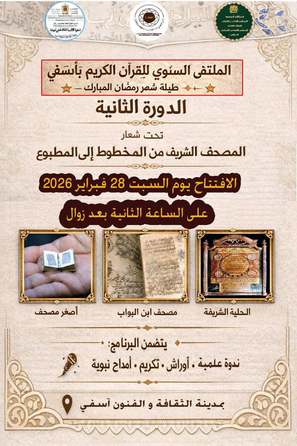 تعيش مدينة آسفي على إيقاع حدث ثقافي وروحي مميز بمناسبة شهر رمضان المبارك، من خلال احتضانها فعاليات “الملتقى السنوي للقرآن الكريم” تحت شعار “المصحف الشريف: من المخطوط إلى المطبوع”، وذلك بفضاء مدينة الثقافة والفنون بآسفي طيلة شهر رمضات الفضيل، في مبادرة تسلط الضوء على عناية المغاربة بكتاب الله عبر مختلف الحقب التاريخية.