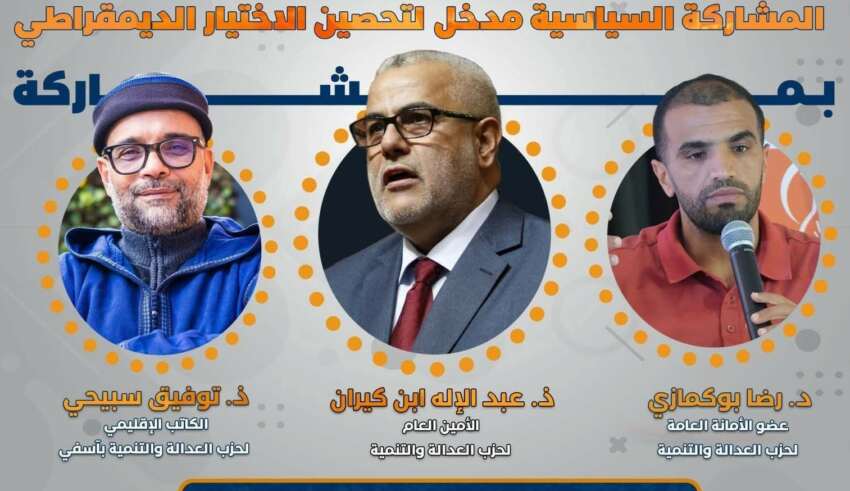تستعد الكتابة الإقليمية لحزب العدالة والتنمية بمدينة آسفي لتنظيم مهرجان خطابي يوم السبت 25 أبريل 2026، ابتداءً من الساعة الخامسة والنصف مساءً، بقاعة المسيح البلدي بآسفي، وذلك تحت شعار: “المشاركة السياسية مدخل لتحصين الاختيار الديمقراطي”. وسيؤطر هذا اللقاء السياسي كل من الأمين العام للحزب عبد الإله ابن كيران، إلى جانب عضو الأمانة العامة رضا بوكمازي، والكاتب الإقليمي للحزب بآسفي توفيق …